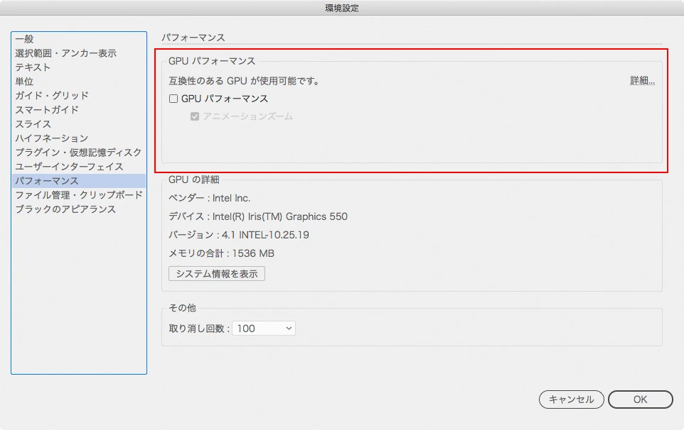 設定は環境設定の「パフォーマンス」で変更できます。