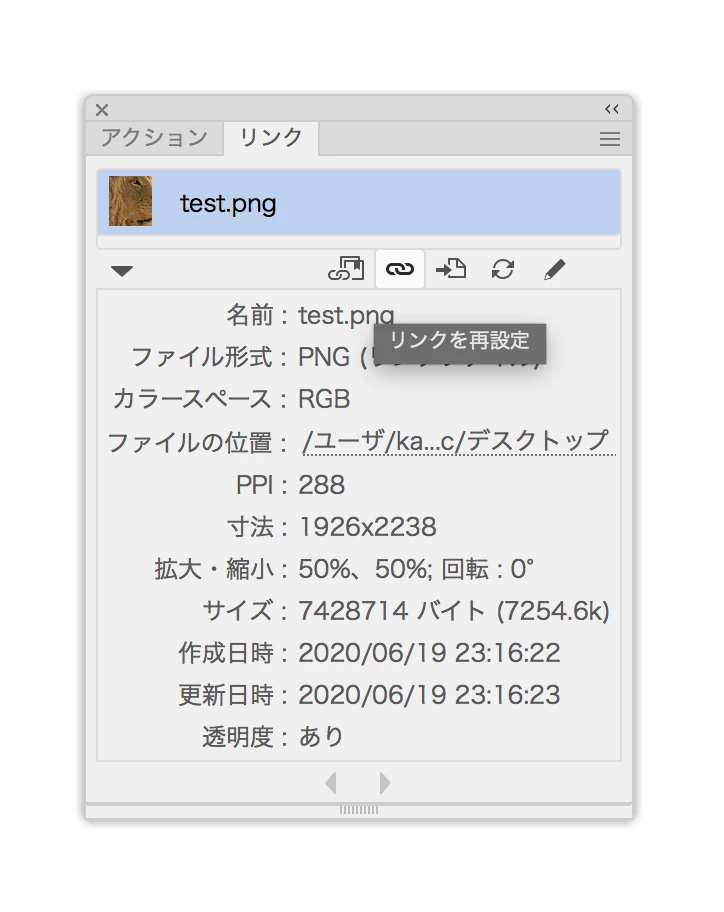 その"リンク切れしているのに気付かずに先の処理を進めてしまう"ことを避けるために、前述したリンクパレットに何かしらのアクションを与えることで凌いでいる状況です。