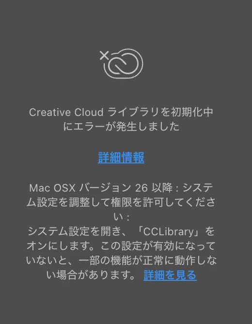 このような表記が出ます。ちなみに詳細のリンクはデスクトップアプリの問題解決のページに飛ぶのですが、1枚目の言う通りにシステム環境設定が関係あるのだとすれば的外れなことが書いてあります。