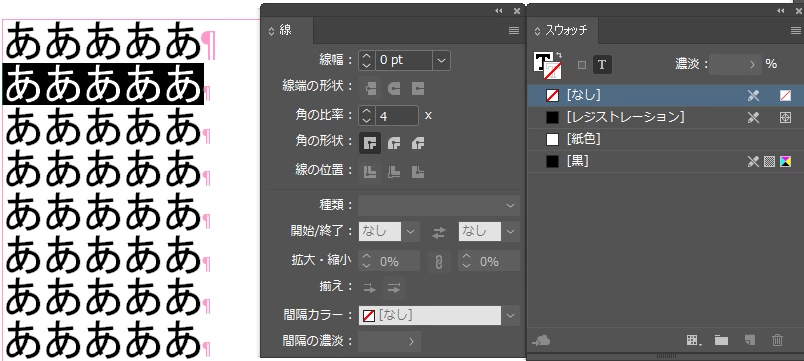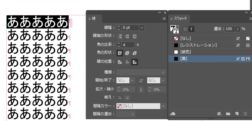 次に書き出されたPDFをIllustratorで開くと、「テキストの線カラー有:線幅0pt」に設定したものの表示がくずれています。