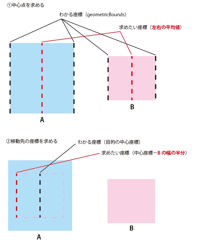 スクリプトで1の中心に合わせて2を同じ位置に移動したいのですが、