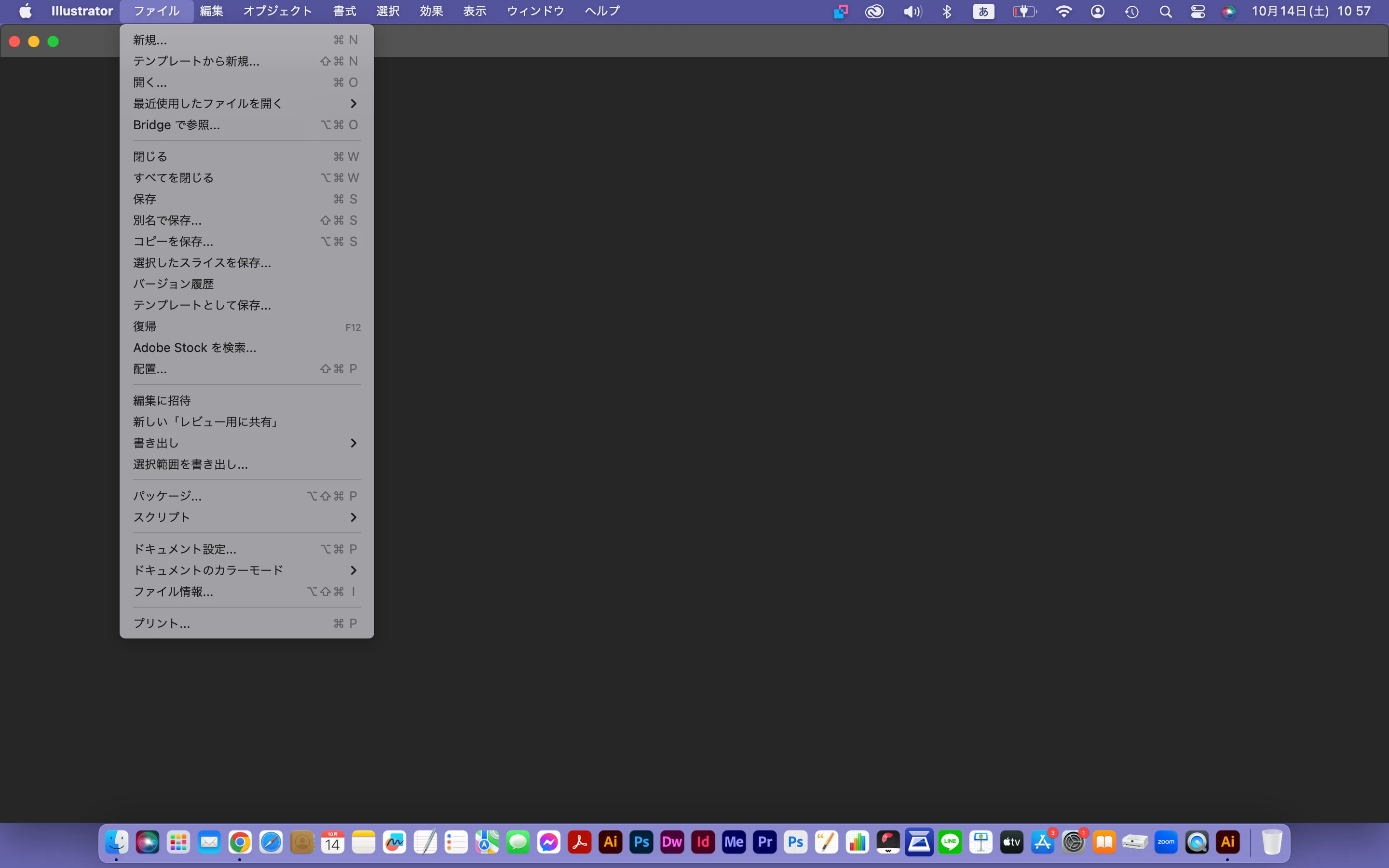 当初、Mac OS はBig Surを使用しておりましたが、Adobe creative cloud デスクトップでイラストレータ2024(最新版)にアップしたところ、下画像のように、メニューバーの反応がありますがそれ以外のショートカットや、最初に現れるであろう新機能紹介などが表示されず、新規書類も作成できない現象がございました。
