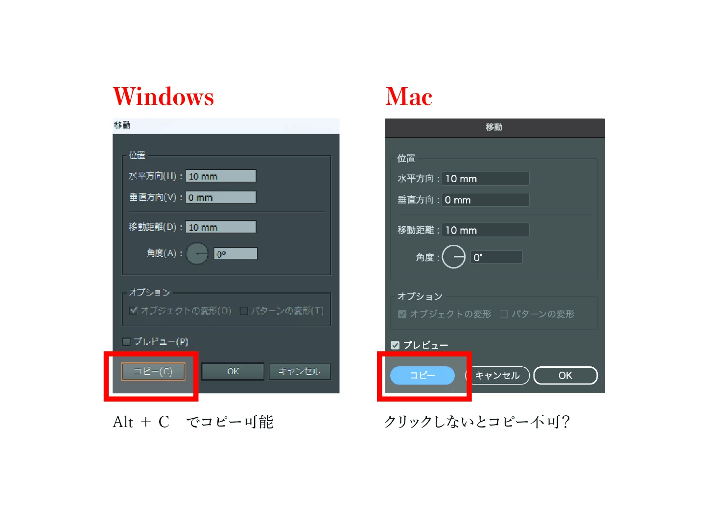 Windows でオブジェクトを選択し数値入力でコピーする時、Alt+Cでコピーしています。