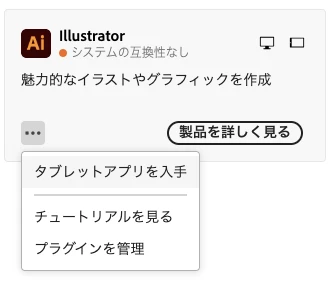 上記「以前のバージョンの Creative Cloud アプリのインストール」を試みましたが、アプリケーション内Illustratorアイコンのプルダウンメニュー(…)には「タブレット版を入手」「チュートリアルを見る」「プラグインを管理」のみで、指示のある「他のバージョン」という項目がありません。