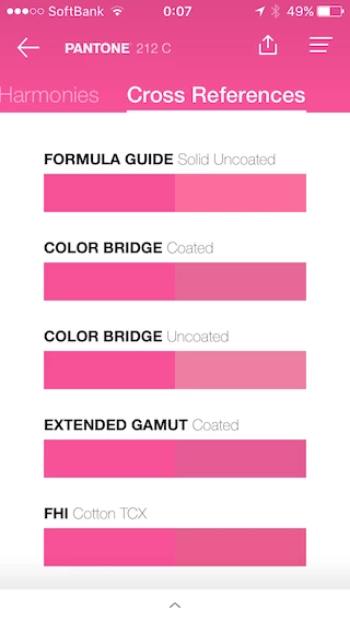 参考にiPhoneのアプリPantone StudioでのPantone+ Solid Coated 212Cと他との比較