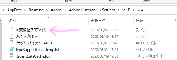 例えば,カスタム線プロファイルを線パネルで保存すると,Settingsフォルダ内に「可変線幅プロファイル」というファイルが作成され,以降プロファイルを追加・削除するごとに「可変線幅プロファイル」が更新される仕組みですが,このファイルは別の環境にコピーしても使えると思います。