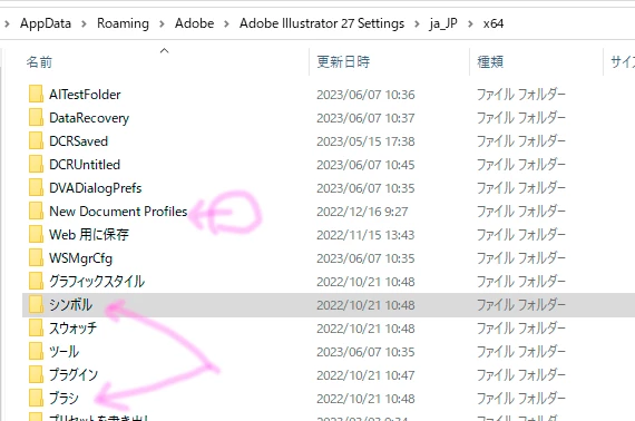 また,ブラシやシンボルなどは,Settingsフォルダ内のブラシフォルダ,シンボルフォルダ内にドキュメントファイルとして保存するかたちです。これも流用できます。