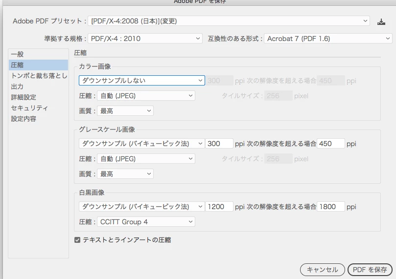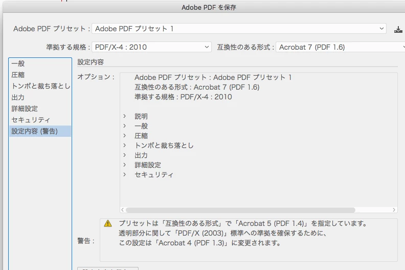 PDFプリセットの作成で透明部分に関してPDF1.3に変更されると警告が出る