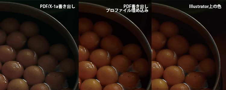 また、上記の通り保存したPDFをIllustratorまたはAcrobatで開くと元の画像の色調で表示されますが、プレビュー.appで開くと、印刷されたものと同じ傾向で彩度が低く表示されます。