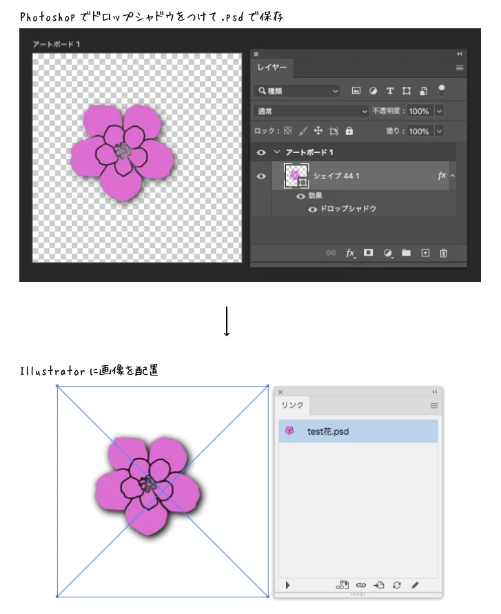 PSの画像(ドロップシャドウで影をつけている)を配置しても、影が反映されない。