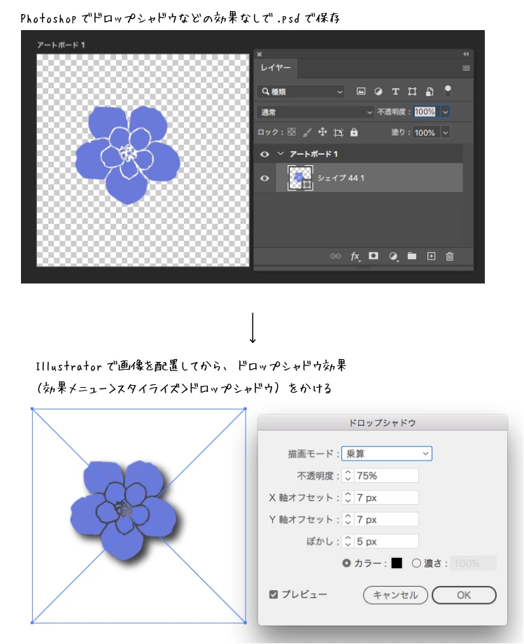 PSのデータを配置したが、ドロップシャドウの効果が反映されない。また、作成した影に効果でボカシをいれると薄い線がでてしまう