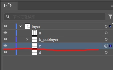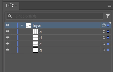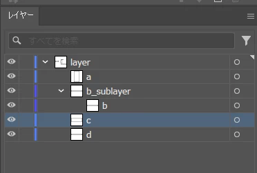 で、示されたレイヤーパネルの状態ではa,b,c,dはpageObjectsとして存在し、サブレイヤーではありません。