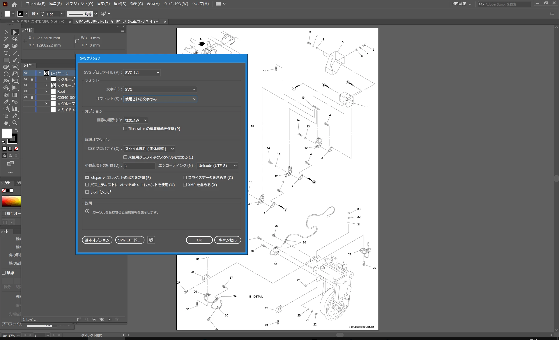 書き出しは .SVGファイルを開き、編集した後「別名で保存」を選び、添付の条件で保存します。
