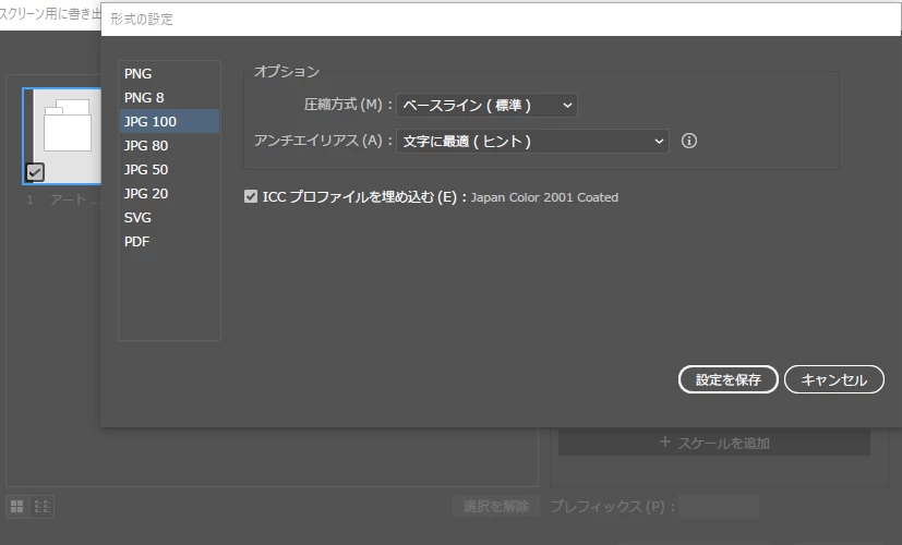 1ファイルに複数のアートボードを作成して書き出すため、スクリーン用~が一括書き出しできて便利なのですが、CMYKのJPGだと色がくすんでしまい困っています。