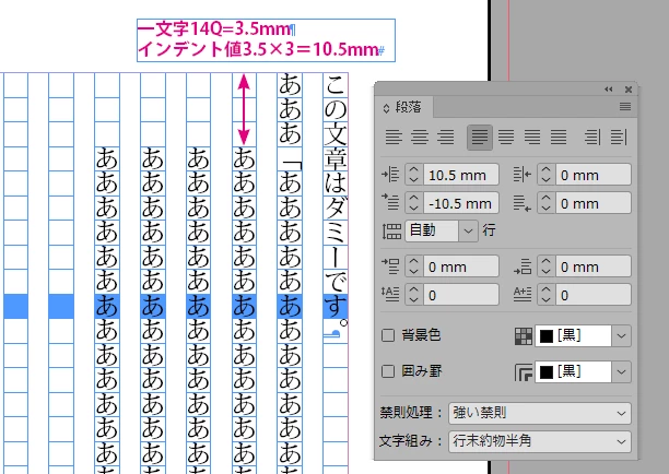 段落パネルの「左/上インデント」と「1行目左/上インデント」に、文字サイズに3をかけた数値を入れてください。(「1行目左/上インデント」はマイナスをつけた数値)