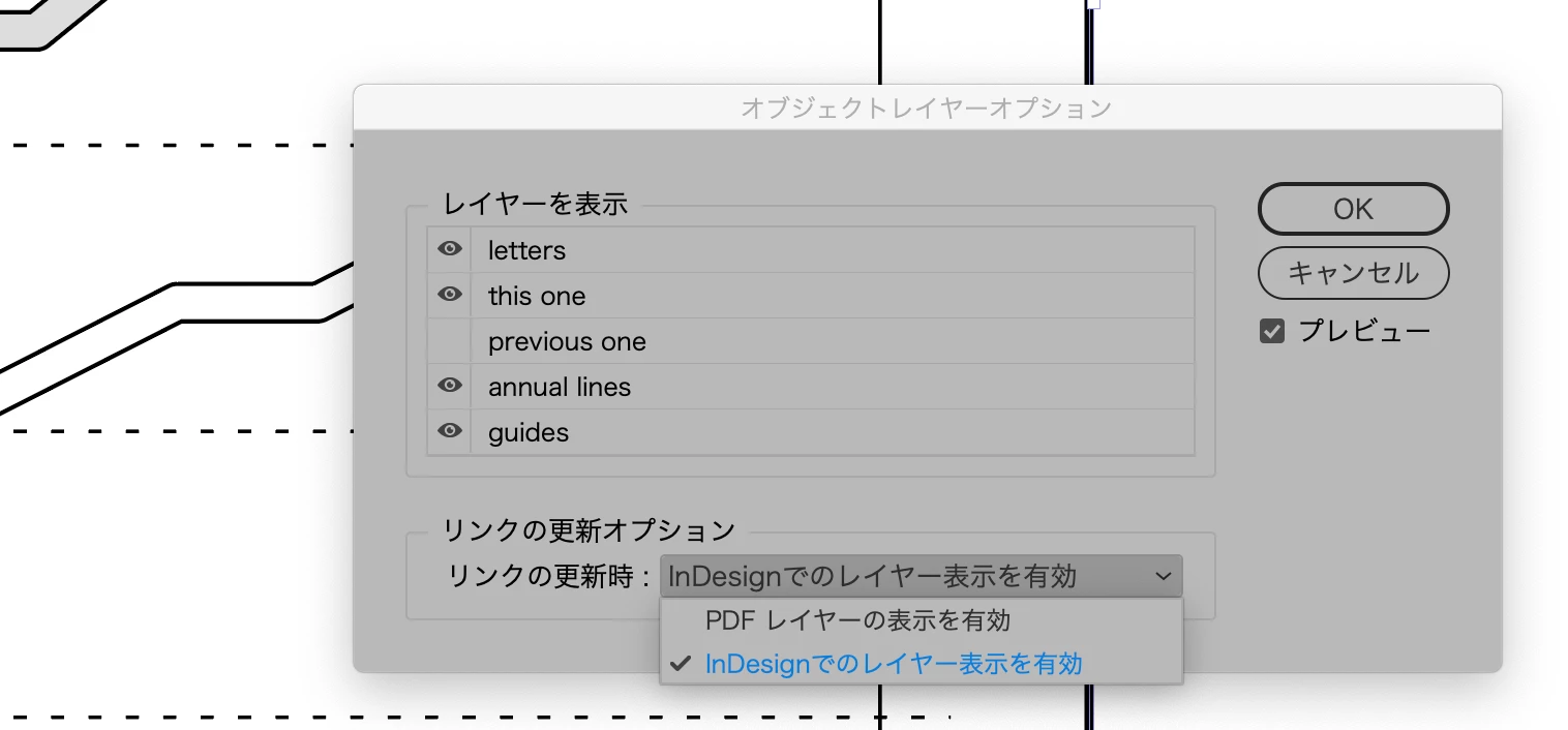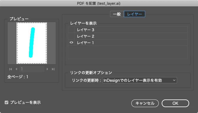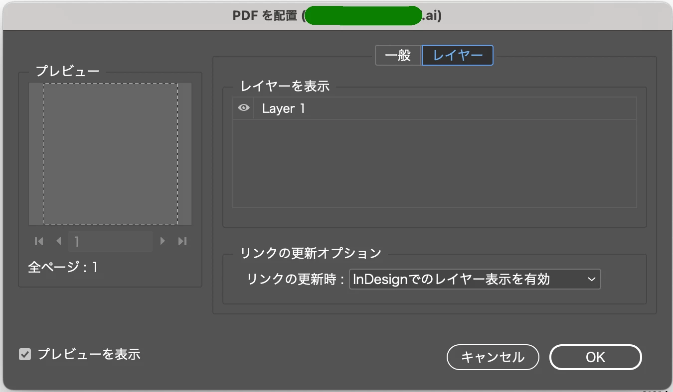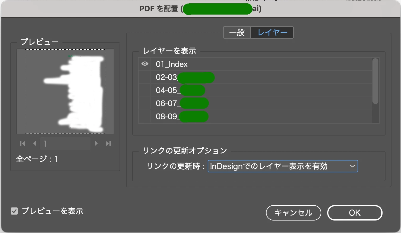 各レイヤーが見えず、インデザインに配置したいページを読み込めません。
