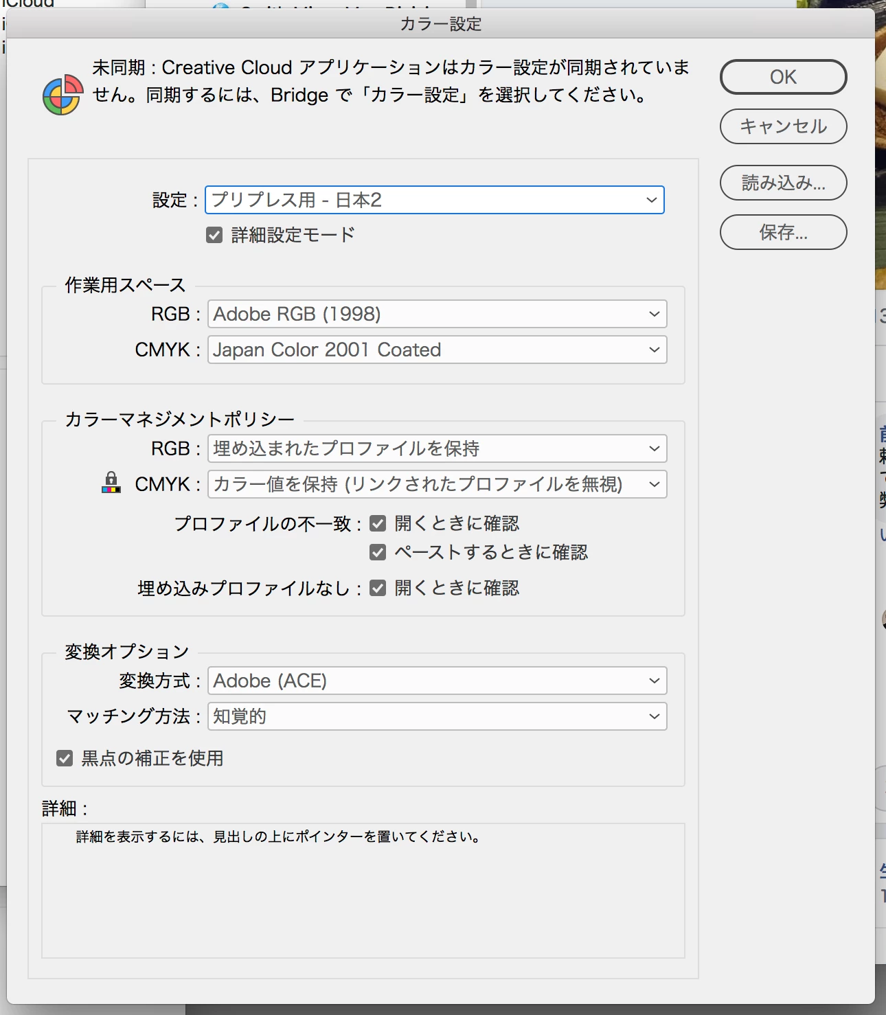 参考までに、うちのInDesign CC2018のカラー設定は以下のようになっています。