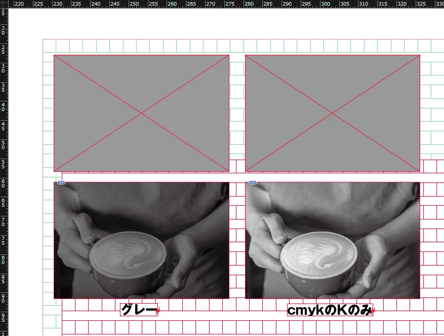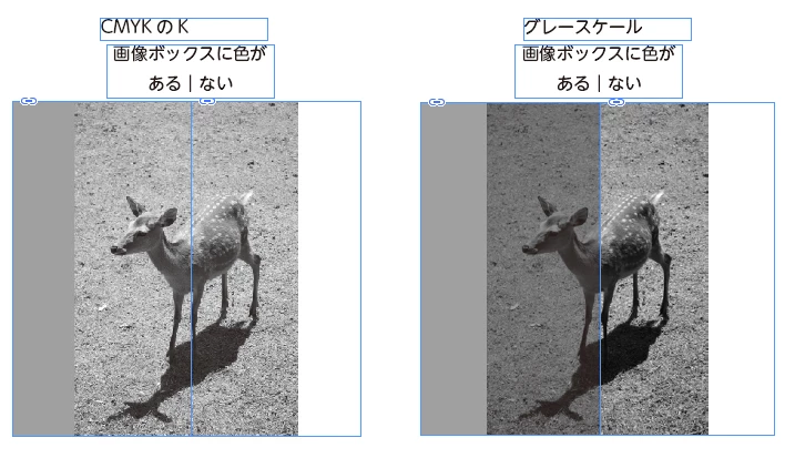 InDesignでは図の写真のようにグレーの画像にフレームの色が乗ってしまいます。4色のk一色も検証してみましたが、こちらは乗りませんでした。