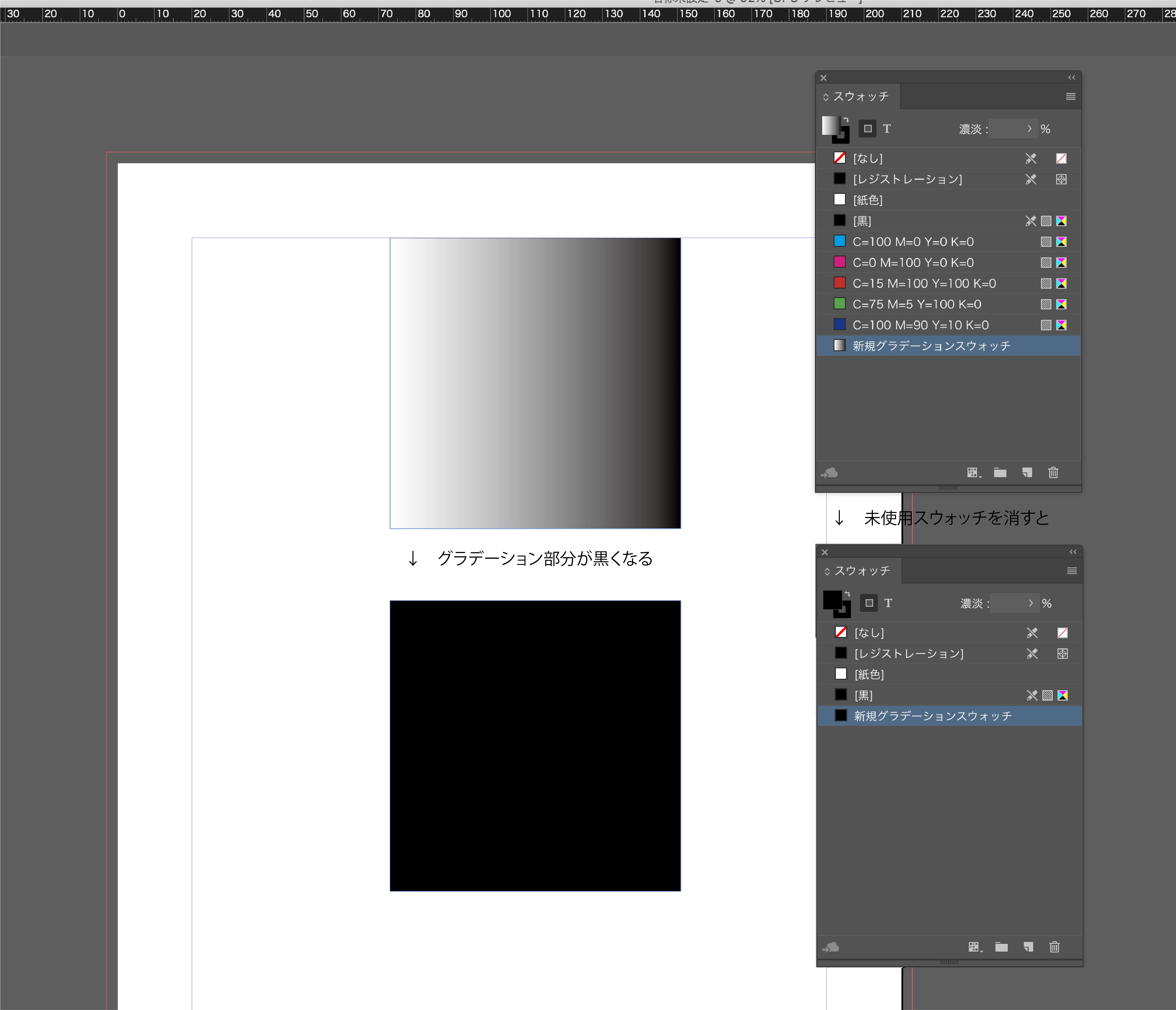 で書いたところ、グラデーションに使われているカラーが削除され、黒くなってしまう現象が起きてしまいます。スウォッチから指定したもの、指定していないものに関わらずです。