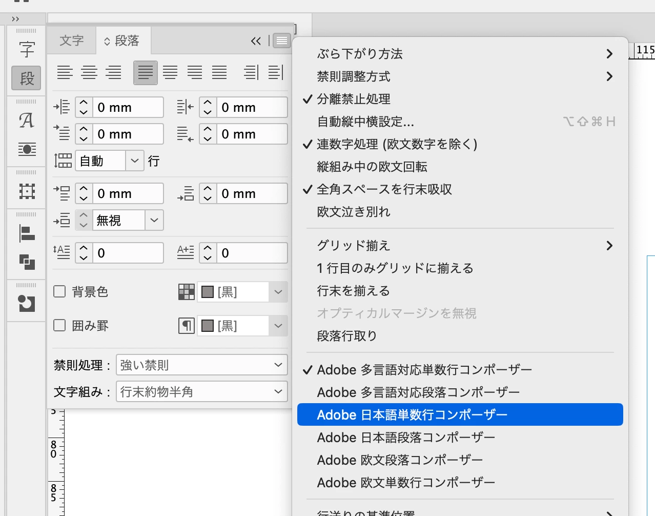 テキストを選択して、パネル右上のパネルメニューで「日本語段落コンポーザー」を選択してください。