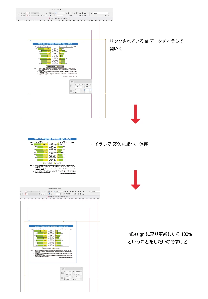 入稿したインデザイン に配置されているイラレのaiデータが何故か99%で貼り込まれているのです。嫌がらせかよ!これを100%で配置したい。