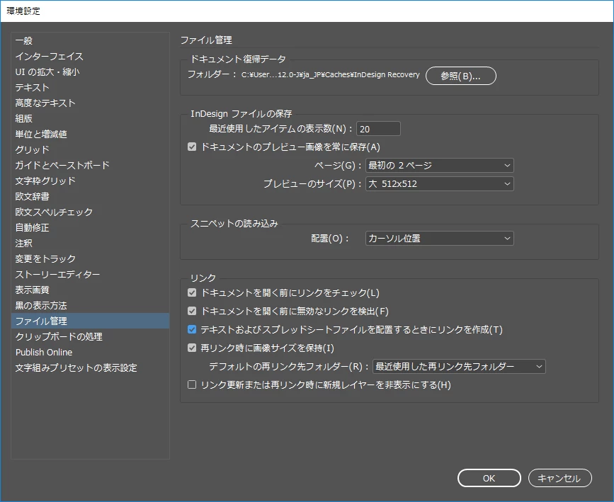 「テキストおよびスプレッドシートファイルを配置するときにリンクを作成」を使用することで
