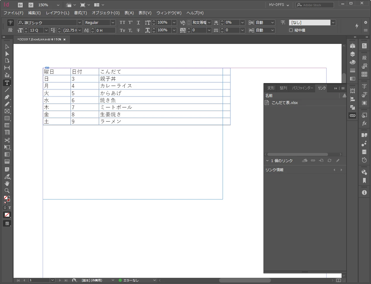 まずは設定した状態と、リンク配置した状態(リンクパネルも含めた確認)をします。