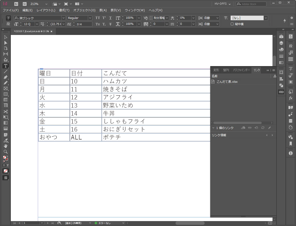 次に一度閉じて、Excelファイルの内容を書き換えた後に該当inddを開いた結果です。