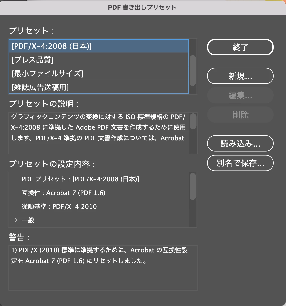 PDFプリセットの説明でいえば、公式で用意している出力の手引きのほうに概要の記載はあります。