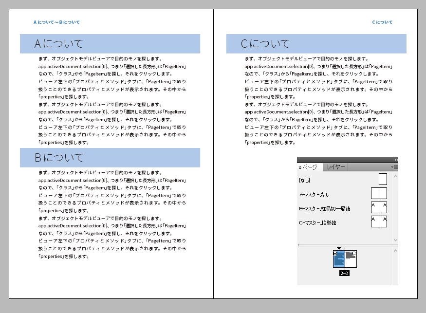 p.1の柱は「Aについて~Bについて」となりいい具合なのですが、p.2の柱は「Cについて~Cについて」となってしまいます。