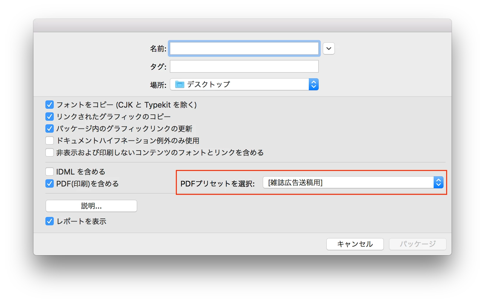 保存したものをパッケージの設定「PDFプリセットを選択:」で選ぶと、PDFの裁ち落としも反映されます。