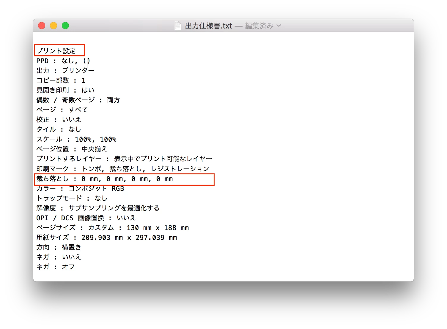ふと思ったのですが、もしかして、仕様書に記載されている裁ち落としの値は、あくまで「プリント設定」の値(紙媒体に直接印刷する際の設定)であって、PDFには「PDFプリセット」で設定した値がきちんと反映されているということでしょうか?
