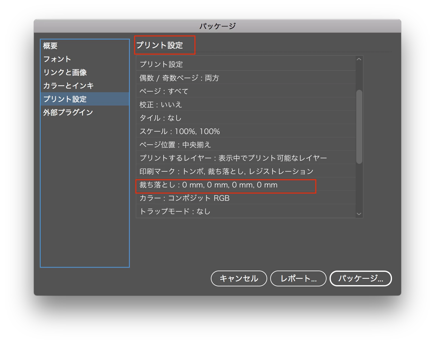 また、ご教授いただきました内容から、ドキュメント設定が一番優先度が高そうですが、パッケージ化する際の最初のダイアログの時点で既に、プリント設定の項目の裁ち落としが0mmとなってしまっております(*3)。