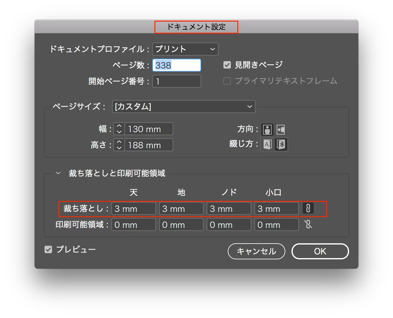 書籍制作のため、「ドキュメント設定」に各3mmの断ち落としを設定しているのですが、