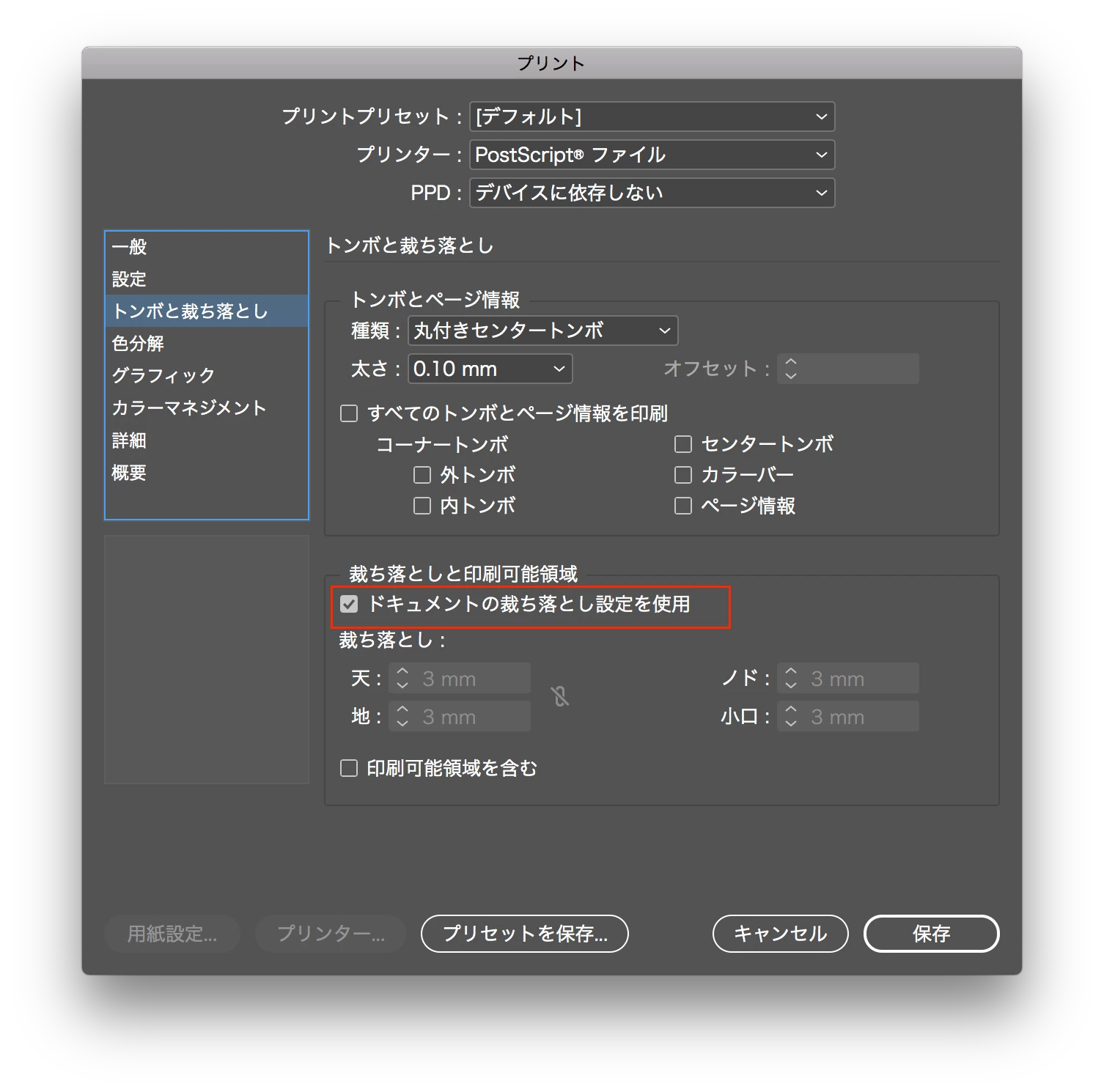 プリントプリセットでも「ドキュメントの裁ち落とし設定を使用」にもチェックが入っている(*5)ため、3mmが反映されているはずなのですが・・・。