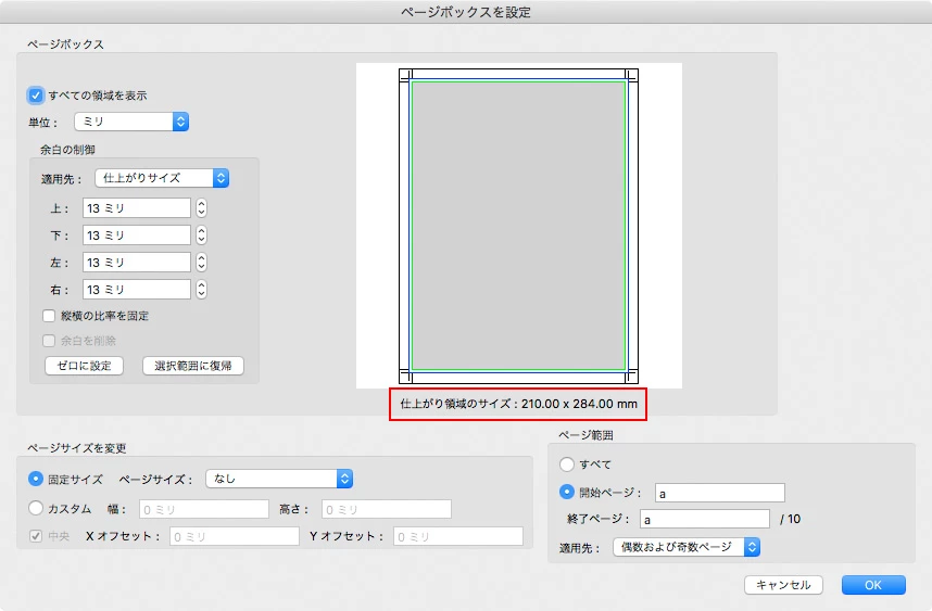塗り足しとドキュメントサイズの設定については、作成されたInDesignドキュメントの「ドキュメント設定」で確認できます。こちらが正しい数値になっていれば、ドキュメント自体にサイズなどの問題はありません。