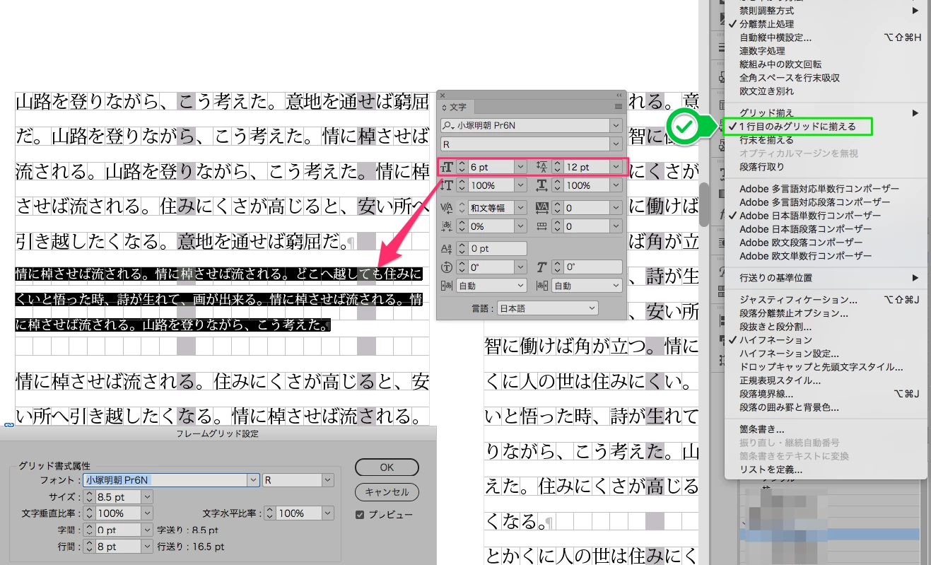 例えば,「1行目のみグリッドに揃える」という設定が,段落パネルメニューにあります。