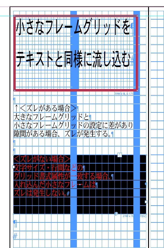 隙間が出てしまうとレイアウトに支障があり、また段落スタイルのグリッド設定でグリッド揃えを「なし」にすると上に詰められるため、フレームグリッドの段数を複数にしている場合は隙間がある分、隣の列とずれてしまうのです。
