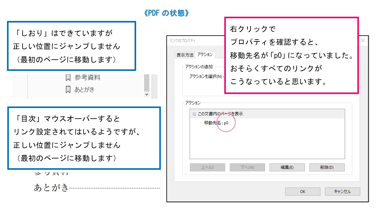 そして、パッケージフォルダ内のブックを開き、PDFを書き出したところ、目次のリンク・しおりのリンクが機能しないようです。