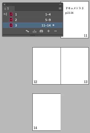 想定されるページ番号としては、ブックパネル、ページパネルに表示されている「11から13」なのですが、ドキュメント自体のノンブルは、