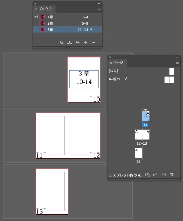 Ch1とCh2はブックパネルで見た通りですが、Ch3のページパネルは奇数始まりの11から13と表示されていますが、ドキュメントそのものは「奇数ページ(=右側頁)」に「10」ページと表示され、「11」「12」と続きます。