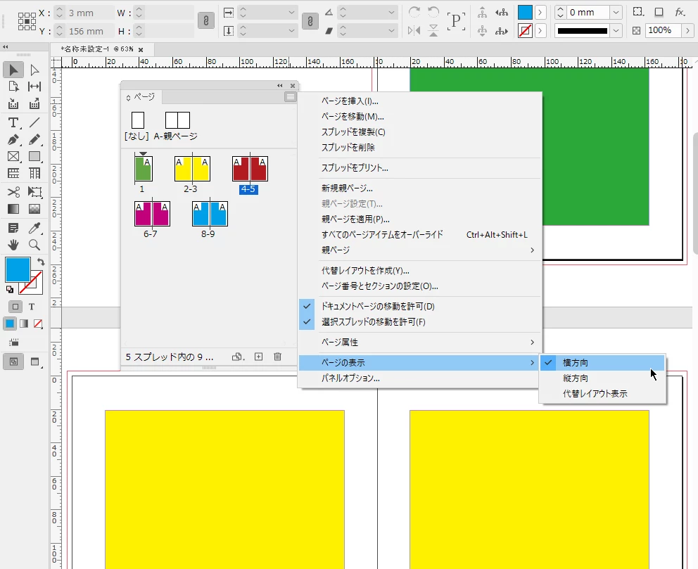 ページパネルのハンバーガーメニューからですね。縦か横かは選べると思います(画像は2022 v17.4.2 / Win10)。