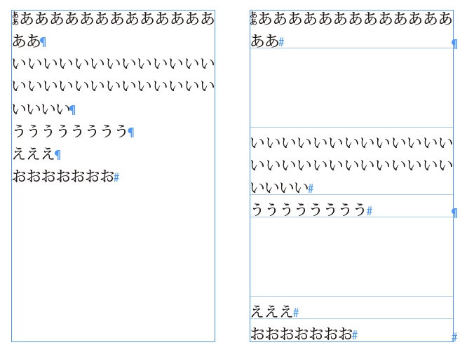 テキストフレームで、行間を「上下両端揃え」にすると、全体で行間が広がりますが_