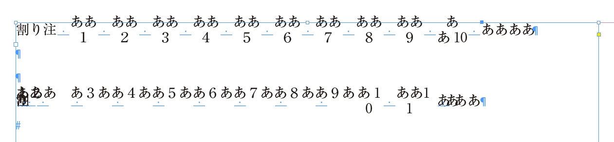 で,手元で確認してみたのですが,割注自体の行数が2より大きいと行中の割注数が11より小さくても崩れました。