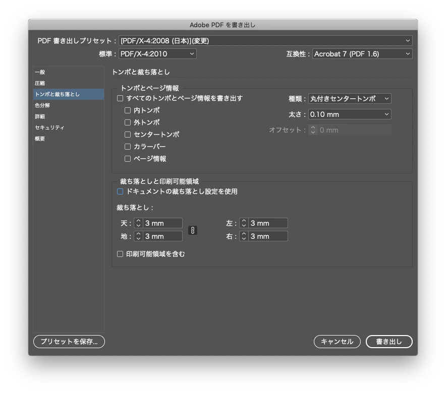 宮宮原俊1759414Participating FrequentlyForum|Forum|6 years agoOctober 25, 2019質問保存についてForum|Forum|6 years agoOctober 25, 2019返信数 2.512 ビューPDFでの保存方法を教えて下さい。制作時は裁ち落とし3mm作ったのですがPDFにしたら裁ち落としが無いと言われました。お願い致します。