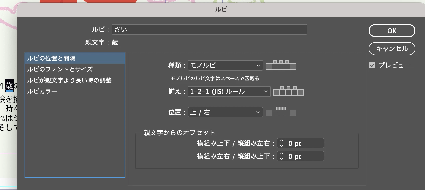 添付の画像のように、ルビを振りたい箇所を選択して、パネルが表示され