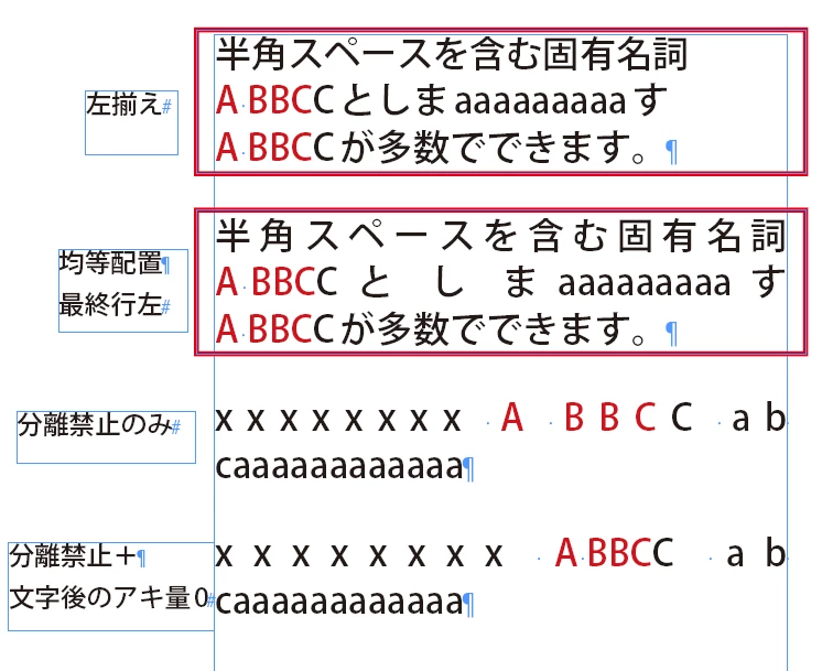 ページものの冊子を作るにあたり、半角スペースを含む固有名詞(仮に「A BBCC」とします)が多数でできます。この固有名詞の中にあるAとBの間のスペースで改行をさせたくないです。