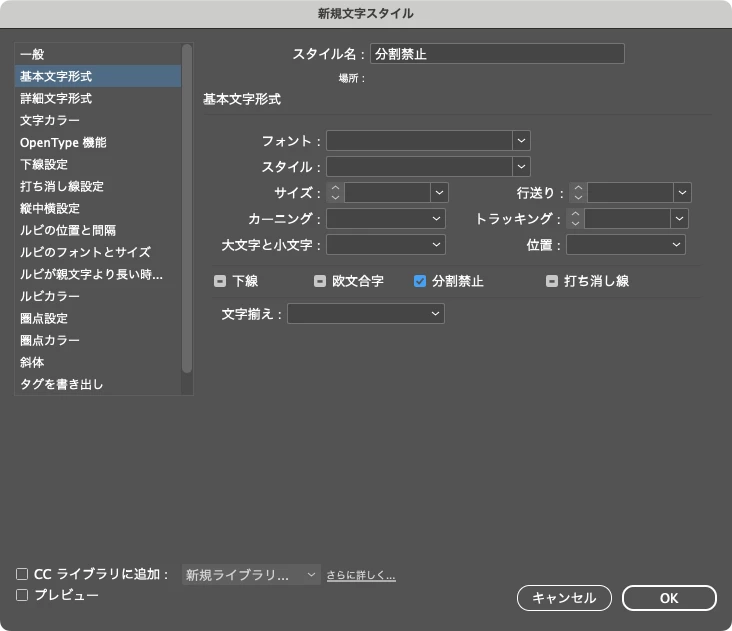 今回でいえば、こんな感じで「分割禁止」だけ設定した文字スタイルを作成しておき、
