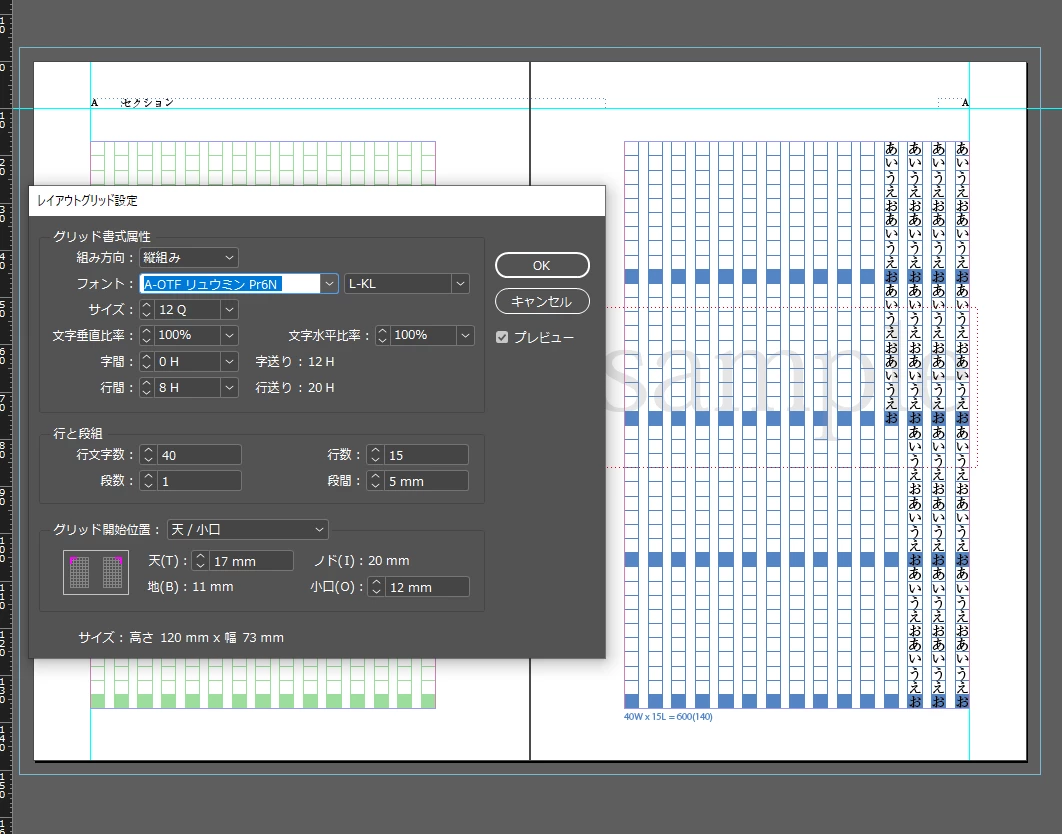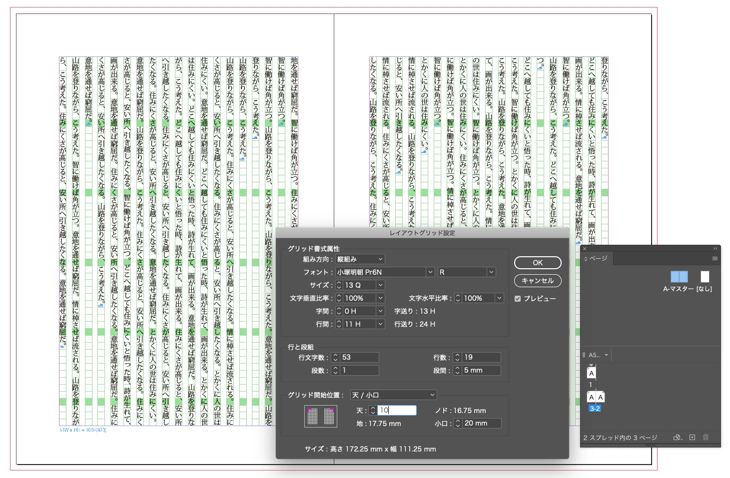 当初、レイアウトグリッド設定で天を17mmに設定し、それに合わせてフレームグリッドを作成し、本文を記載していました。