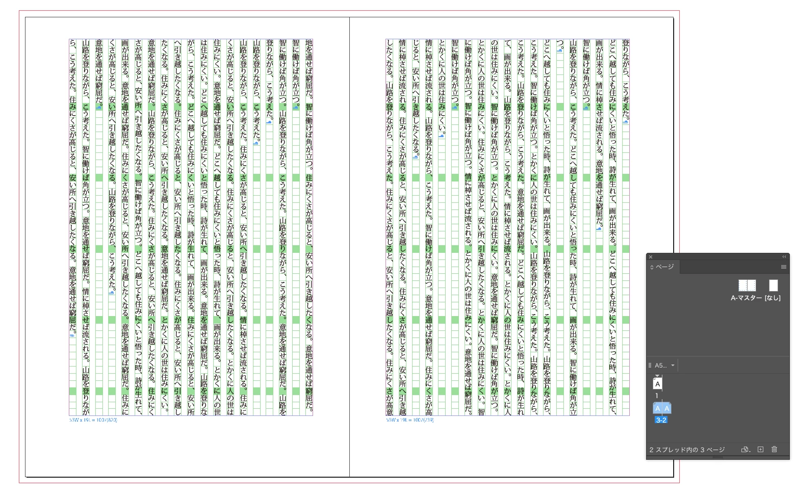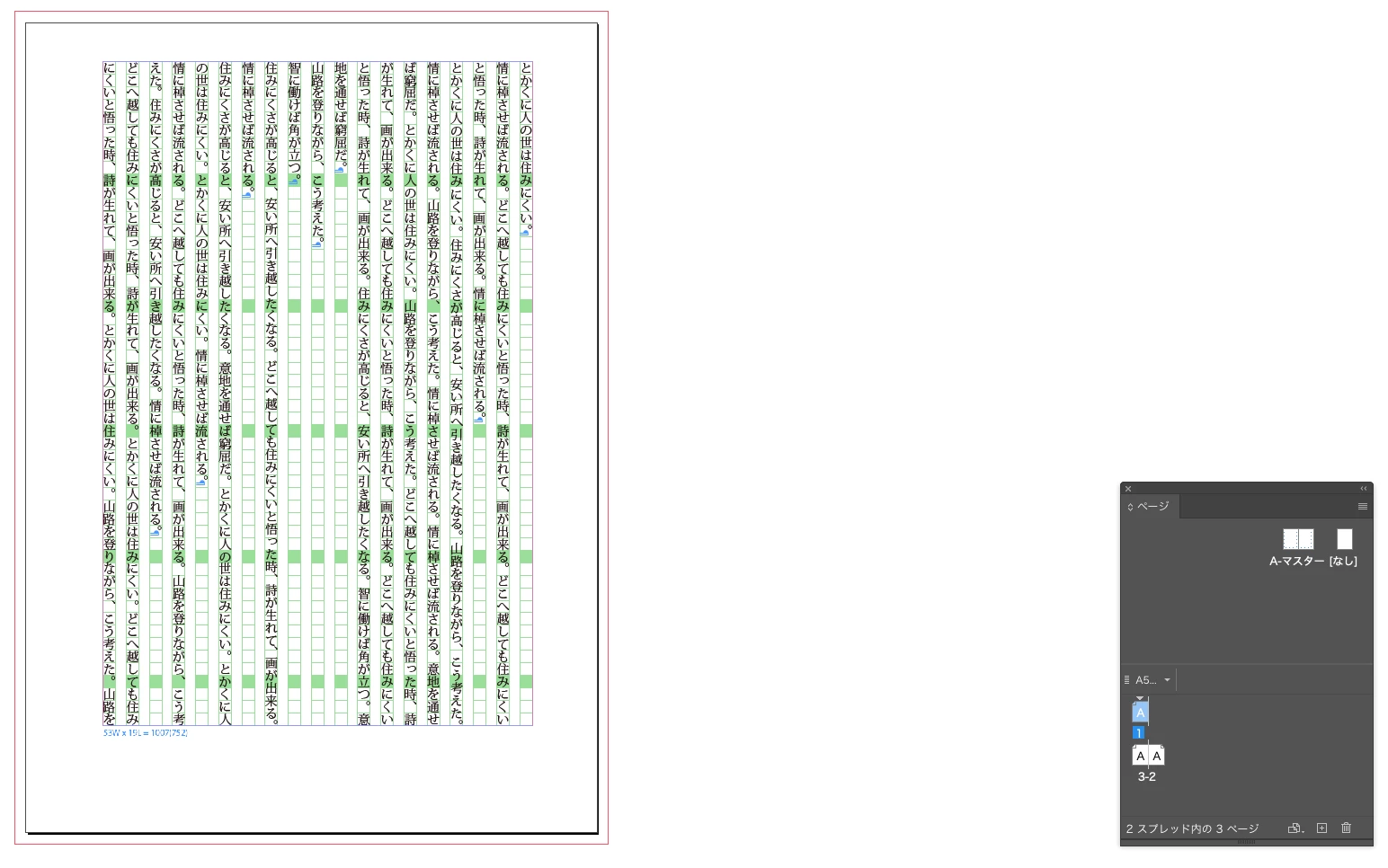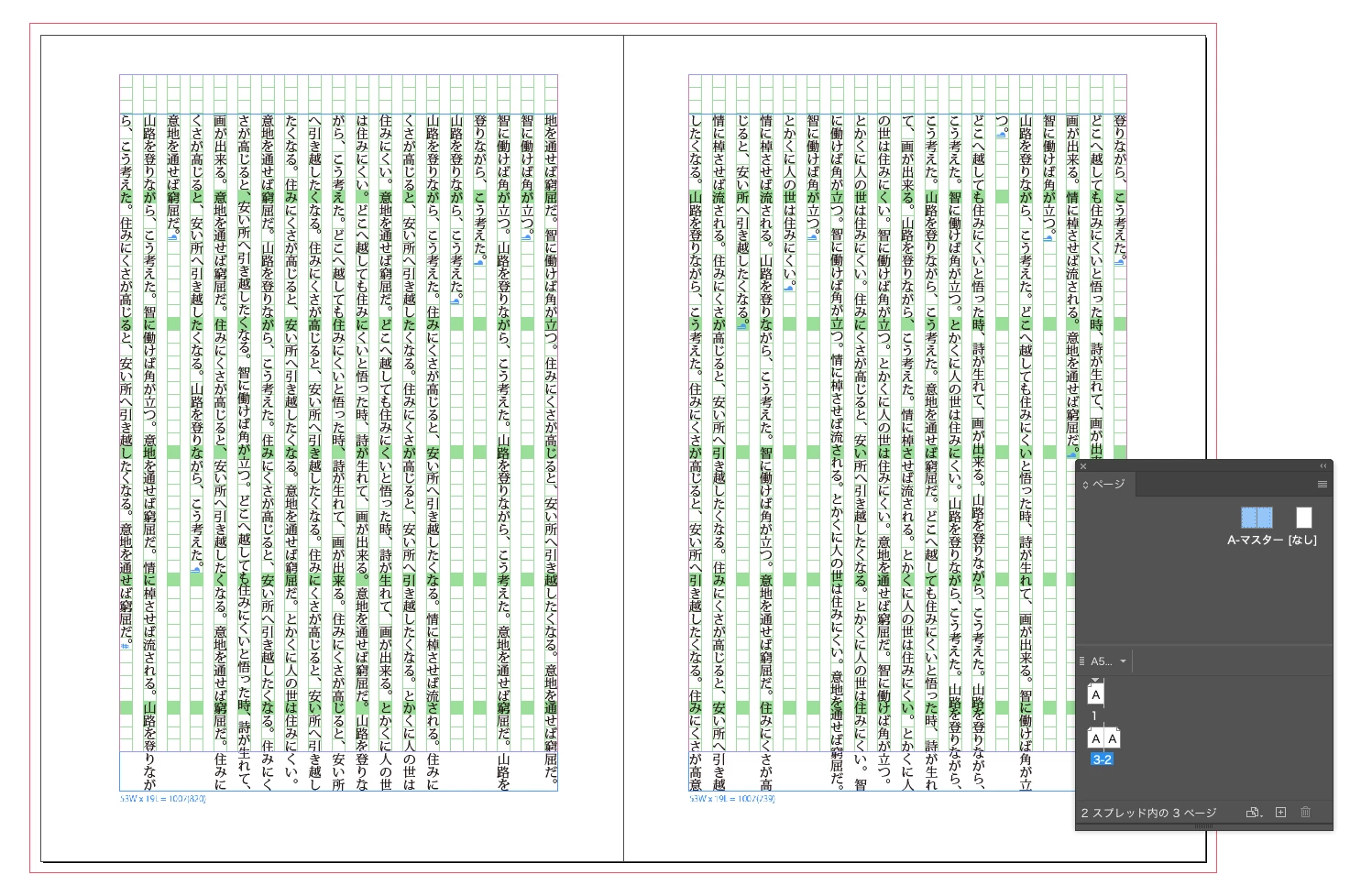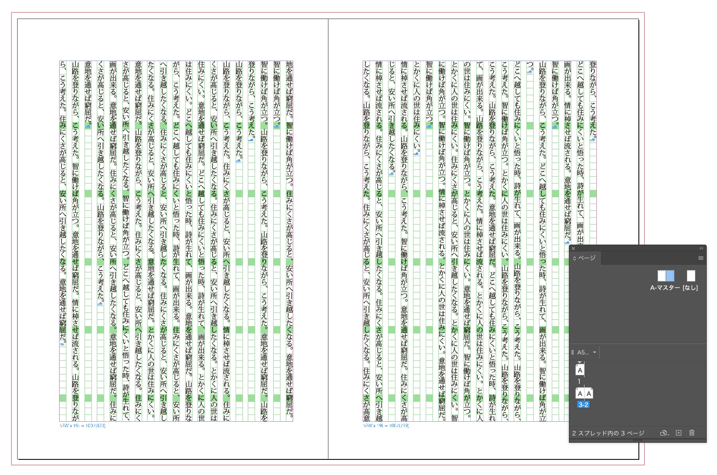まずは下図のように、マスター(親)にテキストフレームを置いて、ドキュメントのページにテキストを流します(図はp.2-3の見開きが見えています)。